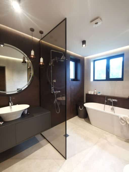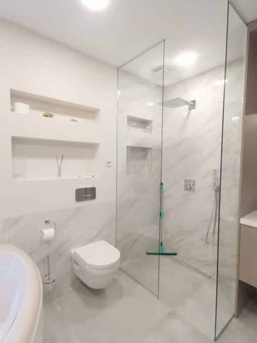 on valmistatud kvaliteetsest 8mm paksusest niiskust hülgavast turvaklaasist, mis on põrutus- ning kuumakindel. Standard dušisein tuleb läbipaistva klaasiga, soovi korral saab tellida disainklaasi – kirgas, pronks, hall, mattvalge, mattpronks või ekstra kirgas toon.